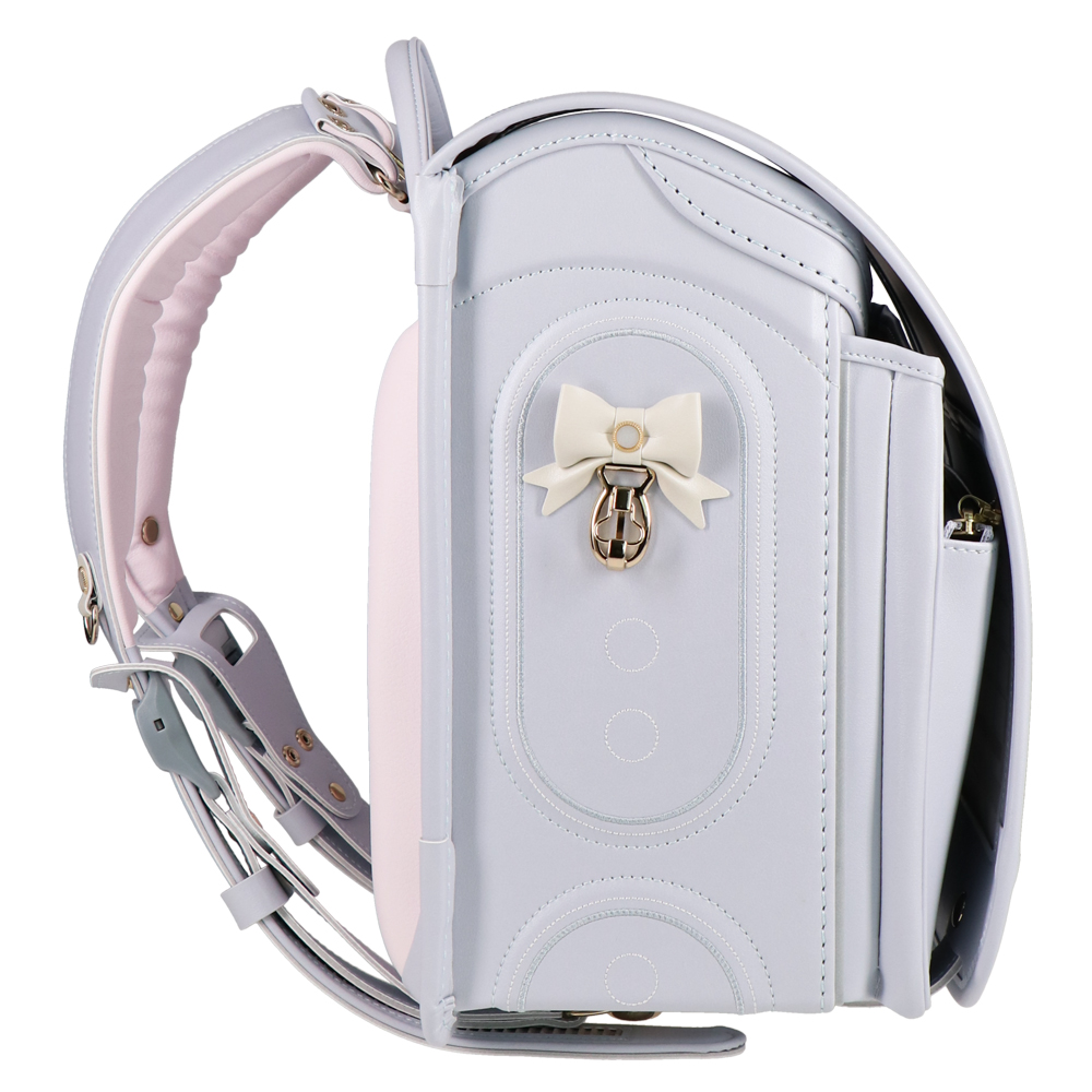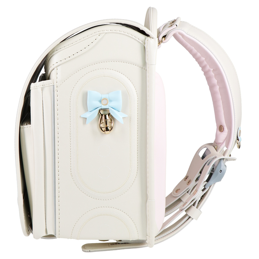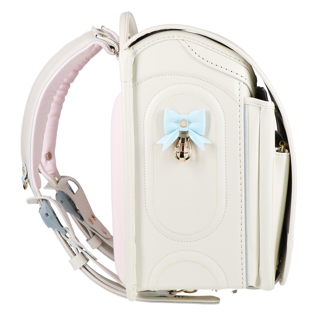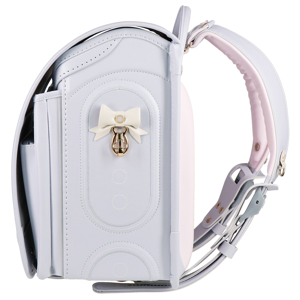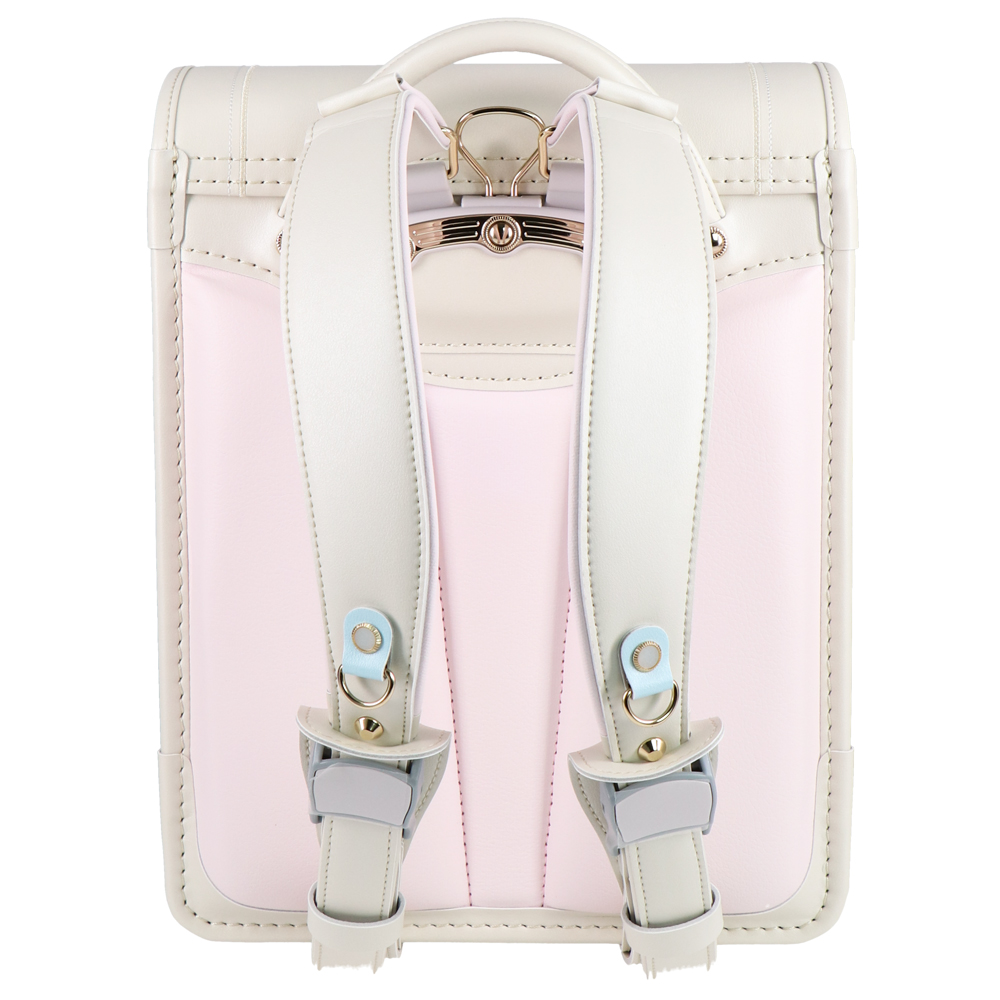 パステルカラーのパール素材とシャンパンゴールドのペンダントや金具がエレガントなランドセル。ラチェット式の肩ベルトは38段階に調節が可能。背中や肩ベルトには背負い心地の良いマシュマロクッションを搭載しているので、肩や腰への負担を軽減。(チェストベルト付き)