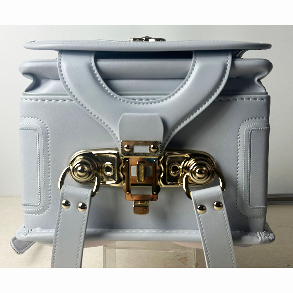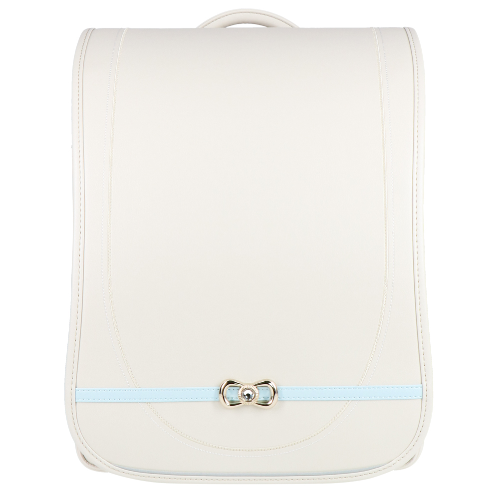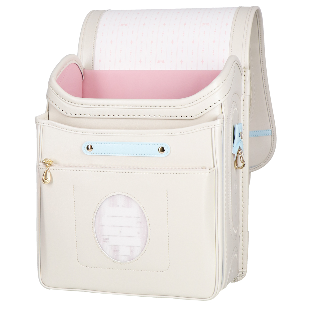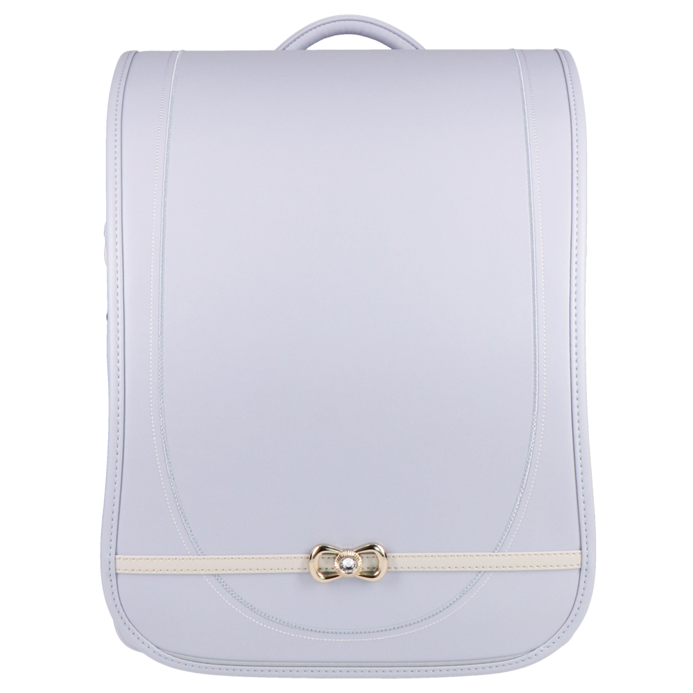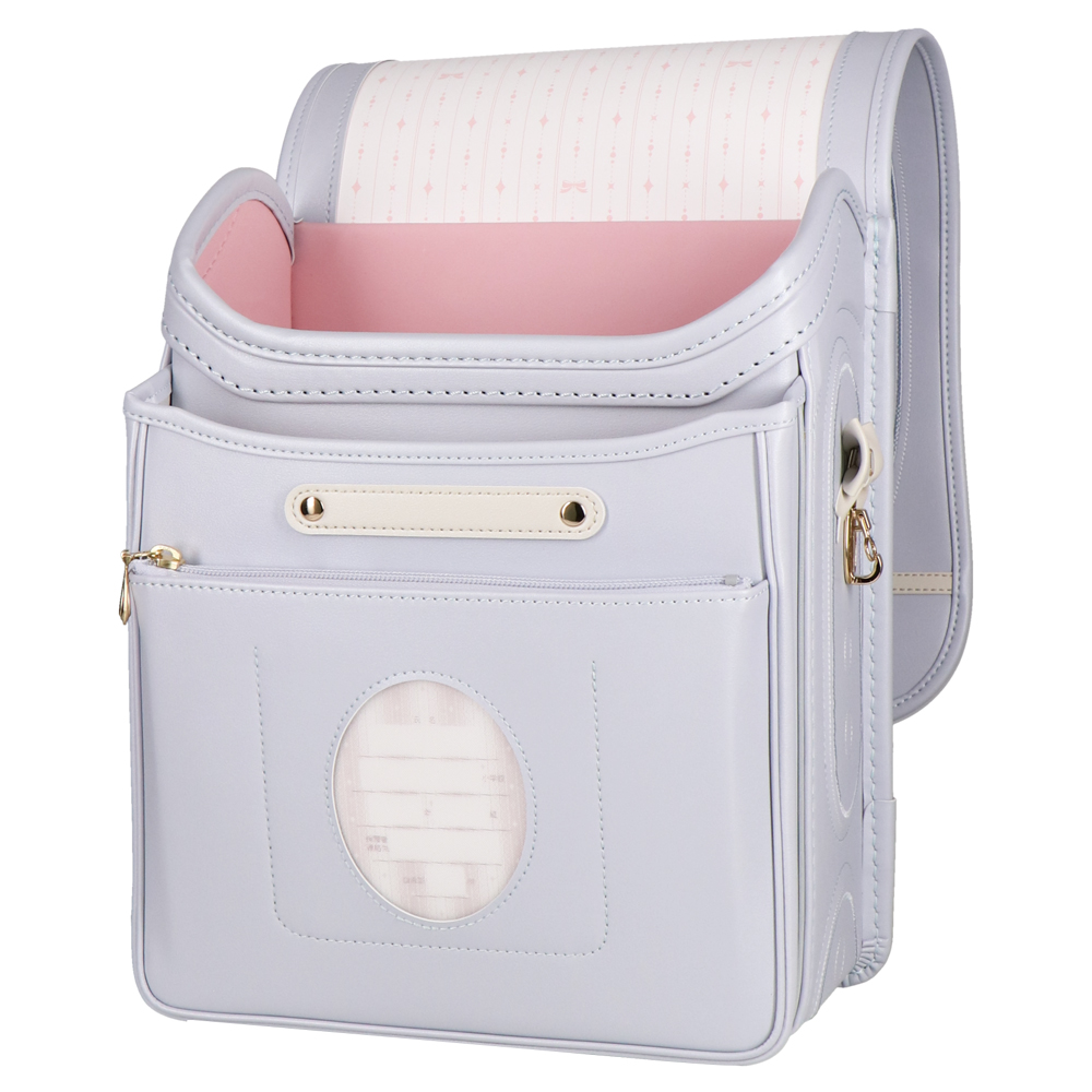 パステルカラーのパール素材とシャンパンゴールドのペンダントや金具がエレガントなランドセル。ラチェット式の肩ベルトは38段階に調節が可能。背中や肩ベルトには背負い心地の良いマシュマロクッションを搭載しているので、肩や腰への負担を軽減。(チェストベルト付き)